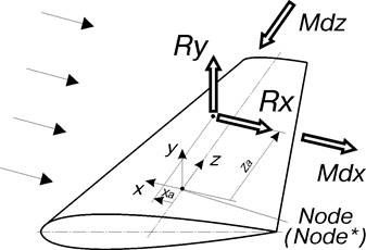 Продольная аэродинамическая сила Rx направлена вдоль вектора X узла Node*. Нормальная аэродинамическая сила Ry направлена вдоль вектора Y узла Node*. Аэродинамическая сила вдоль вектора Z узла Node* принимается равной нулю. Демпфирующий момент Mdx направлен вдоль вектора Х узла Node*. Демпфирующий момент Mdz направлен вдоль вектора Z узла Node*. Демпфирующий момент вокруг вектора Y узла Node* принимается равным нулю. Значения аэродинамических сил и демпфирующих моментов определяются на основании характеристик среды, заданных коэффициентов аэродинамических сил и производных коэффициентов демпфирующих моментов. Точка приложения аэродинамических сил называется центром аэродинамического давления. Координаты центра аэродинамического давления Xa и Za определяются на основании заданных функций смещения от центра узла Node*.
