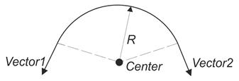 Данный метод создает дугу окружности радиуса R с центром в точке Center. Дуга ограничивается точками касания с прямыми, направление которых задано векторами Vector1 и Vector2.