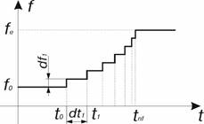 Таким образом создается ступенчатая функция зависимости частоты гармонических колебаний от времени. График функции изображен на рис. 5.