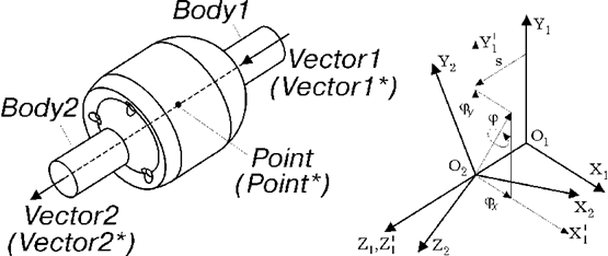 Данный идеальный шарнир с равными угловыми скоростями позволяет второму звену двигаться поступательно относительно первого звена вдоль оси передачи вращения, связанной с первым звеном. Эта ось задается точкой Point и вектором Vector1. Ось передачи вращения, связанная со вторым звеном, задана точкой Point и вектором Vector2. В модели используются копии этих объектов Point*, Vector1* и Vector2*. Точка Point* и вектор Vector1* прикрепляются к первому звену. Вектор Vector2* прикрепляется ко второму звену.