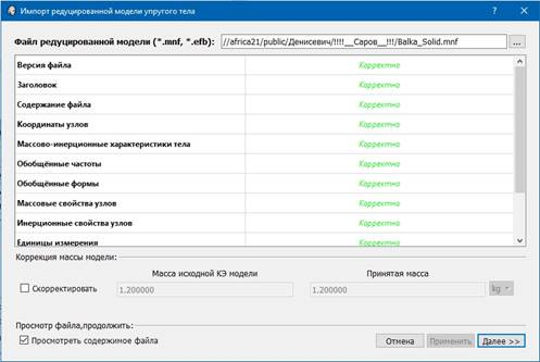 На первом этапе пользователь загружает, например, mnf-файл. После нажатия кнопки «Применить» в таблице отображаются блоки, содержащиеся в файле и флаг корректности их чтения для загруженного файла (рис. 6). Загруженная модель отображается в окне Вид расчетной модели упругого тела. Помимо этого, в момент нажатия кнопки «Применить» рассчитывается и отображается исходная масса по данным из файлов. В нижней части окна можно просмотреть и откорректировать массу редуцированной модели. Для внесения изменений необходимо уставить флажок напротив редактируемой величины. Для перехода к следующему этапу необходимо нажать кнопку «Далее».
