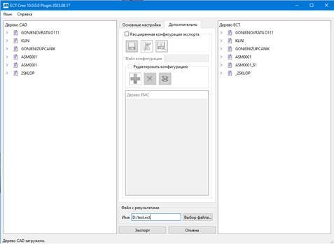 На вкладке «Дополнительно» расположен флажок «Расширенная конфигурация экспорта», который управляет методом экспорта, и инструменты для задания расширенных настроек экспорта (см. рис. 15), которые могут быть сохранены в EMC-файл. Возможны два варианта экспорта: