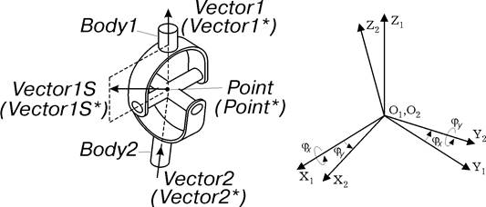 Крестовина, соединяющая звенья, имеет взаимно перпендикулярные оси вращения. Эти оси пересекаются в центре шарнира, заданном точкой Point. Оси вращения крестовины перпендикулярны соответствующим осям передачи вращения звеньев, заданным точкой Point и векторами Vector1 и Vector2. Вектор Vector1S задает направление оси вращения крестовины относительно первого звена. В модели используются копии этих объектов Point*, Vector1*, Vector2* и Vector1S*. Точка Point*, векторы Vector1* и Vector1S* прикрепляются к первому звену. Вектор Vector2* прикрепляется ко второму звену.