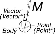 2. Создается вектор Vector*, который в момент создания совпадает с вектором Vector. В зависимости от значения необязательного именованного параметра fixing вектор Vector*либо прикрепляется к звену Body, либо не прикрепляется к звену и во время движения механизма может перемещаться относительно звена, отслеживая положение вектора Vector. Вектор Vector* определяет положительное направление момента.