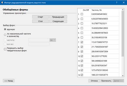 Более подробно процедура создания mnf-файла в КЭ-комплексах ANYS APDL и NASTRAN описано в главе «Генерация файлов в КЭ комплесах для ПК EULER». Импорт моделей производился согласно алгоритму, описанному в главе 4 «Импорт редуцированных моделей в ПК EULER» Коэффициент затухания для всех форм задавался равным 0.1.