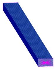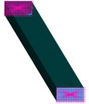 Все балки были сделаны с достаточно мелкой КЭ-сеткой с большим числом элементов, чтобы получить наиболее точные результаты по НДС. Интерфейсные узлы располагаются на торцах балки. При создании балок в ANSYS APDL 18.2 были использованы элементы SOLID185, характерный размер элемента – L/400. При скреплении интерфейсных узлов в первом случае использовался метод «паутина». Так как на торцах было большое число узлов. Во втором случае, при скреплении интерфейсных узла с узлами торцов балки методом ограничения перемещений, все узлы связываются с интерфейсными элементами CERIG, так как зависимые узлы можно легко выбрать по области. В третьем случае КЭ-модель балки создавалась в PATRAN 12 элементами “CTETRA10” с характерным размером L/200. При генерации mnf-файла было запрошено 6 собственных форм. На рис. 7 показан внешний вид КЭ-моделей балок.