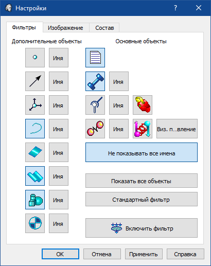 Для указанных в окне типов объектов устанавливается режим отображения, который распространяется на все объекты этого типа. Если кнопка с пиктограммой объекта отжата, то все объекты соответствующего типа не отображаются. Справа от пиктограммы типа объекта находится кнопка с надписью Имя. Если эта кнопка отжата, то при отображении объектов соответствующего типа их имена выводиться не будут.