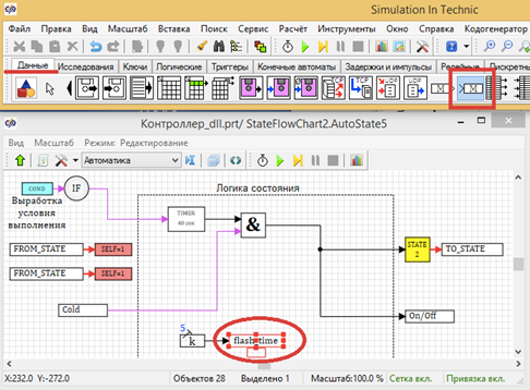 Откройте проект Нагреватель_загрузчик_dll. Запустите его на расчет и убедитесь, что теперь автомат индикации работает правильно и меняет частоту индикации в зависимости от режима. (рис. 36).