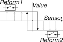 Переключатель работает по значению заданного датчика. Он выполняет первое изменение механизма при значении датчика, меньшем заданного значения переключения. Второе изменение механизма выполняется при значении датчика, большем заданного значения переключения.