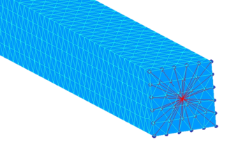 В качестве интерфейсных узлов можно указать только узлы с 6-ю степенями свободы. Поэтому мастер-узлы должны принадлежать элементам: “CBEAM”, “CQUAD4”, “CTRIAR”, “RBAR” и “RBE2”. Однако, желательно, связывать интерфейсный узел с областью на КЭ-модели жесткими элементами, а для моделей построенных на основе твердотельных элементов и элементов с менее чем 6 степенями свободы в узлах, таких как “CBAR”, “CQUAD4” и “CTRIAR3”, которые имеют только 5 степеней свободы в узлах это ОБЯЗАТЕЛЬНО. Для этого необходимо создать дополнительный узел в окрестности предполагаемого места взаимодействия упругого тела с механической системой. Это можно сделать во вкладке (“Elements” -> “Create” -> “Node”), задав при этом также ID будущего интерфейсного узла. После чего необходимо жестко соединить данный узел с соседними узлами сетки. Для этого удобно использовать соединение узла с гранью во кладке “Utilities” -> “FEM-General” -> “RBE2/RBE3 Spider”. Далее выбрать все шесть степеней свободы в разделе “Dependent DOF”, указать ID предварительно созданного интерфейсного узла в поле “Ref Node ID“ и скрепляемую с ним поверхность в поле “Geom Surface/Face“. Аналогичные связи можно создавать между парами узел-ребро, узел-КЭ и др. На рис. 2 показан пример соединения интерфейсного узла с узлами в сечении с помощью RBE2-элементов.