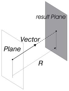 Данный метод создает плоскость путем параллельного переноса исходной плоскости Plane по направлению вектора Vector на расстояние R. Если значение R меньше нуля, то создается плоскость, которая отстоит от Plane на расстояние abs(R) в направлении, противоположном направлению вектора Vector (См. рис. 4).