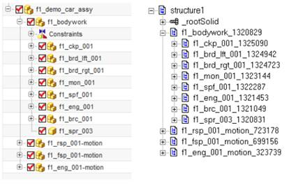 Рис. 2. Дерево модели в NX (слева) и после экспорта в EULER (справа).