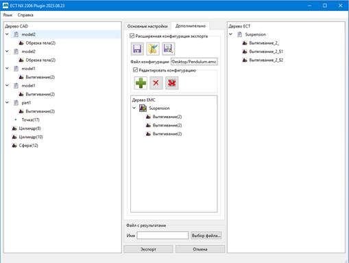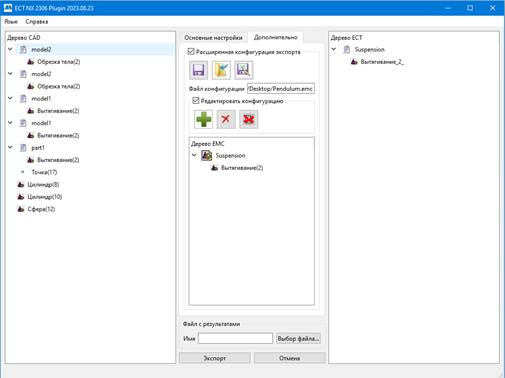 Клик мышкой по элементу дерева САПР model1.Вытягивание(2) выделяет цветом на модели САПР одно из искомых «ушек». Аналогичным образом находим второе искомое «ушко», которое будет иметь точно такое же полное имя, т.к. для создания этих объектов использован один и тот же файл детали. Далее находим параллелепипед – part1.Вытягивание(2) и т.д. На рис. 11 также показаны установки вкладки «Основные настройки». Обратите внимание, что если на вкладке «Дополнительно» стоит флажок «Расширенная конфигурация экспорта», то иерархическая структура ожидаемого результата конвертации в «Дерево ECT» определяется содержимым раздела «Дерево EMC». Если «Дерево EMC» пустое, то и «Дерево ECT» будет пустым.