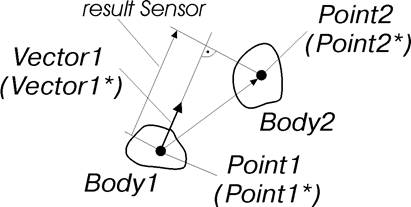 Значением датчика является длина проекции отрезка, соединяющего точку Point1* на звене Body1 и точку Point2* на звене Body2. Проекция осуществляется на вектор, зависящий от заданного значения необязательного именованного параметра fixingVector = … . Если параметр fixingVector = lockVector: или его значение не задано, то значением датчика является проекция отрезка на вектор Vector1*. Если параметр fixingVector = unlockVector:, то значением датчика является проекция отрезка на вектор Vector1.Точки Point1* и Point2* являются копиями заданных точек Point1 и Point2, а вектор Vector1* - копией заданного вектора Vector1 и совпадают с ними в момент создания. Точки Point1* и Point2* создаются при переводе проекта из режима редактирования в режим исследования и прикрепляются соответственно к звеньям Body1 и Body2. Если у датчика необязательный именованный параметр fixingVector = lockVector: или его значение не задано, то при переводе проекта из режима редактирования в режим исследования создается вектор Vector1* и прикрепляется к звену Body1.