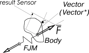 Исходный вектор для проецирования вектора силы, действующей на звено Body со стороны внешнего воздействия FJM. При необходимости создается копия этого вектора Vector* и прикрепляется к звену Body.