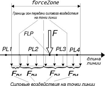 forceZone = scalar [length]Размер зоны воздействия силового элемента на линию. Более подробно описание распределения силового воздействия на линию дано в описании элемента и представлено на рис. 4. По умолчанию значение forceZone равно минимальному расстоянию между двумя соседними точками, образующими линию.