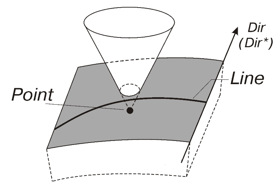 Данный силовой элемент может быть использован и для расчета контактного взаимодействия между сферой и поверхностью, образуемой заданной линией при ее перемещении в заданном направлении. Для этого необходимо определить необязательный именованный параметр RC – радиус контактирующей сферы; заданная пользователем точка Point при этом интерпретируется как центр этой сферы.