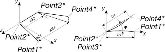 Исходная точка силового воздействия элемента на первое звено. Копия этой точки Point1* прикрепляется к первому звену. Зеркальная копия точки Point1*, симметричная относительно центральной плоскости кручения, Point4* прикрепляется к четвертому звену. Точки Point1* и Point4* используются для расчета силового воздействия элемента.
