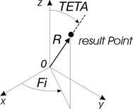 Положение точки определяется значениями сферических координат Fi, Teta, R в системе координат проекта (см. рис. 5).