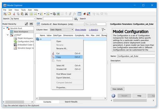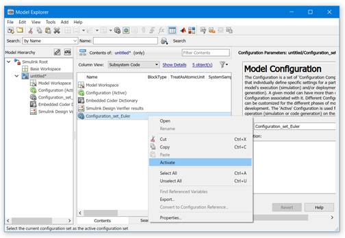 В центральной части окна Model Explorer должно появиться новое поле Configuration_set_Euler. Щёлкните по нему правой кнопкой мыши, выберите пункт Activate (рис. 8).