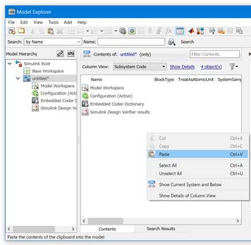 Слева выберите поле, совпадающее с названием модели, щёлкните по нему левой кнопкой мыши. В центральной части окна Model Explorer щёлкните правой кнопкой мыши по пустому пространству (рис. 7). Выберите пункт Paste.