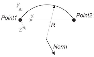 Данный метод создает дугу окружности или окружность заданного радиуса, проходящую через две заданные точки. Плоскость, в которой располагается дуга, определяется вектором нормали.