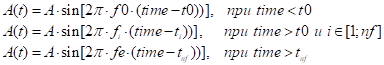 В момент времени t0 происходит первое изменение частоты на величину df, она зависит от количества участков постоянной частоты n, начальной и конечной частоты колебаний f0 и fe, а также от параметра freqChange.