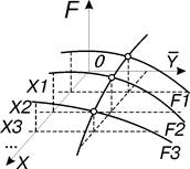 Функция представляет собой линейную интерполяцию по аргументу X функции, заданной точками (xi, Fi), где xi – значение аргумента i-ой точки, а Fi – значение функции при X=xi. Значения функции Fi задаются функциями, имеющими собственные независимые аргументы Y1, Y2, … , Yn. В результате создаваемая функция F имеет аргументы X, Y1, Y2, … , Yn. Вид создаваемой функции F(X,Y), в которой функции Fi зависят от одного аргумента Y=Y1 представлен на рис. 8.