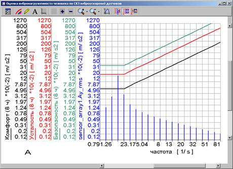 Оценка вибронагруженности с помощью СКЗ виброускорений отображается в окне Оценка вибронагруженности человека по СКЗ виброускорений. СКЗ виброускорений отображаются в виде 1/3 октавных полос со среднегеометрическими частотами 0.8, 1, 1.25, 1.6, 2, 2.5, 3.15, 4, 5, 6.3, 8, 10, 12.5, 16, 20, 25, 31.5, 40, 50, 63, 80 Гц. На графике также отображаются предельные значения виброускорений, соответствующие уровням безопасности, усталости и комфорта. На рис. 1 представлен внешний вид окна Оценка вибронагруженности человека по СКЗ виброускорений.