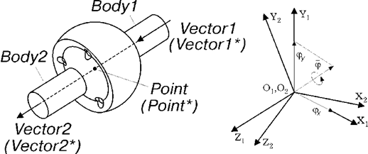 Шарнир соединяет два звена и имеет две степени свободы. Шарнир является идеальным шарниром равных угловых скоростей и представлен на. рис. 8. Оси передачи вращения шарнира заданы точкой Point и векторами Vector1 и Vector2. В модели используются копии этих объектов Point*, Vector1* и Vector2*. Точка Point* и вектор Vector1* прикрепляются к первому звену. Вектор Vector2* прикрепляется ко второму звену.