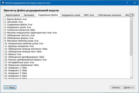 На первом этапе пользователь загружает, например, mnf-файл. После нажатия кнопки «Применить» в таблице отображаются блоки, содержащиеся в файле и флаг корректности их чтения для загруженного файла (рис. 6). Загруженная модель отображается в окне Вид расчетной модели упругого тела. Помимо этого, в момент нажатия кнопки «Применить» рассчитывается и отображается исходная масса по данным из файлов. В нижней части окна можно просмотреть и откорректировать массу редуцированной модели. Для внесения изменений необходимо уставить флажок напротив редактируемой величины. Для перехода к следующему этапу необходимо нажать кнопку «Далее».