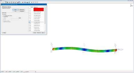 Для запуска просмотра необходимо нажать кнопку «Старт»; остановка производится с помощью кнопки «Стоп». Форма для отображения выбирается либо с помощью кнопок «Предыдущая», «Следующая», либо мышкой в списке справа. Также доступно перемещение с помощью клавиатуры с помощью стрелок «Вверх»/«Вниз» Внешний вид расчетной модели во время просмотра форм изображен на рис. 8. Отбор форм для расчета осуществляется либо вручную, либо по количеству и/или частоте. Для выбора форм вручную необходимо установить переключатель Выбор форм в состояние вручную и мышкой убрать галочки у исключаемых форм. В расчет включаются все формы, отмеченные галочками. Также доступен отбор форм по количеству и/или частоте, установить переключатель Выбор форм в состояние по максимальной частоте и количеству. Для изменения максимальной частоты MaxFreq (по умолчанию равно INF, т.е. бесконечности) и/или количества форм maxModeNum (по умолчанию также равно INF) необходимо выставить галочку слева от изменяемой величины. При этом выбирается не более maxModeNum форм с частотой не более MaxFreq.