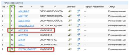 ID объекта – это идентификационный номер (в общем случае неуникальный). Его значение приобретает особое значение только при экспорте сборки (.asm). В этом случае ID объекта для компонента сборки берется как ID элемента (Feature), соответствующего этому компоненту в сборке. Пример списка элементов показан на рис. 12.