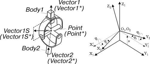 Исходный вектор, задающий направление оси передачи вращения первого звена. Копия этого вектора Vector1* прикрепляется к первому звену. Вектор Vector1* задает направления оси передачи вращения первого звена в процессе движения исследуемого механизма.