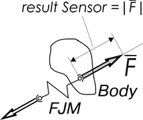 Значением датчика является абсолютная величина вектора силы, действующего на звено со стороны механической связи (силовой элемент, шарнир или программное движение).Размерность значения датчика - [force].