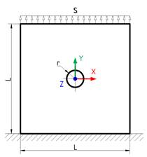В данном примере будет исследована точность определения НДС в ПК EULER в окрестности отверстий на упругой модели. В качестве объекта исследования выступает пластина с отверстием, изображенная на рис. 11.