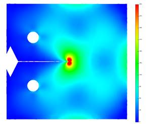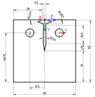 В данном примере будет исследована точность определения НДС в ПК EULER в окрестности трещины. В качестве объекта исследования выступает пластина с 2 отверстиями и трещиной. На рис. 18 изображена схема модели испытания пластины с размерами.