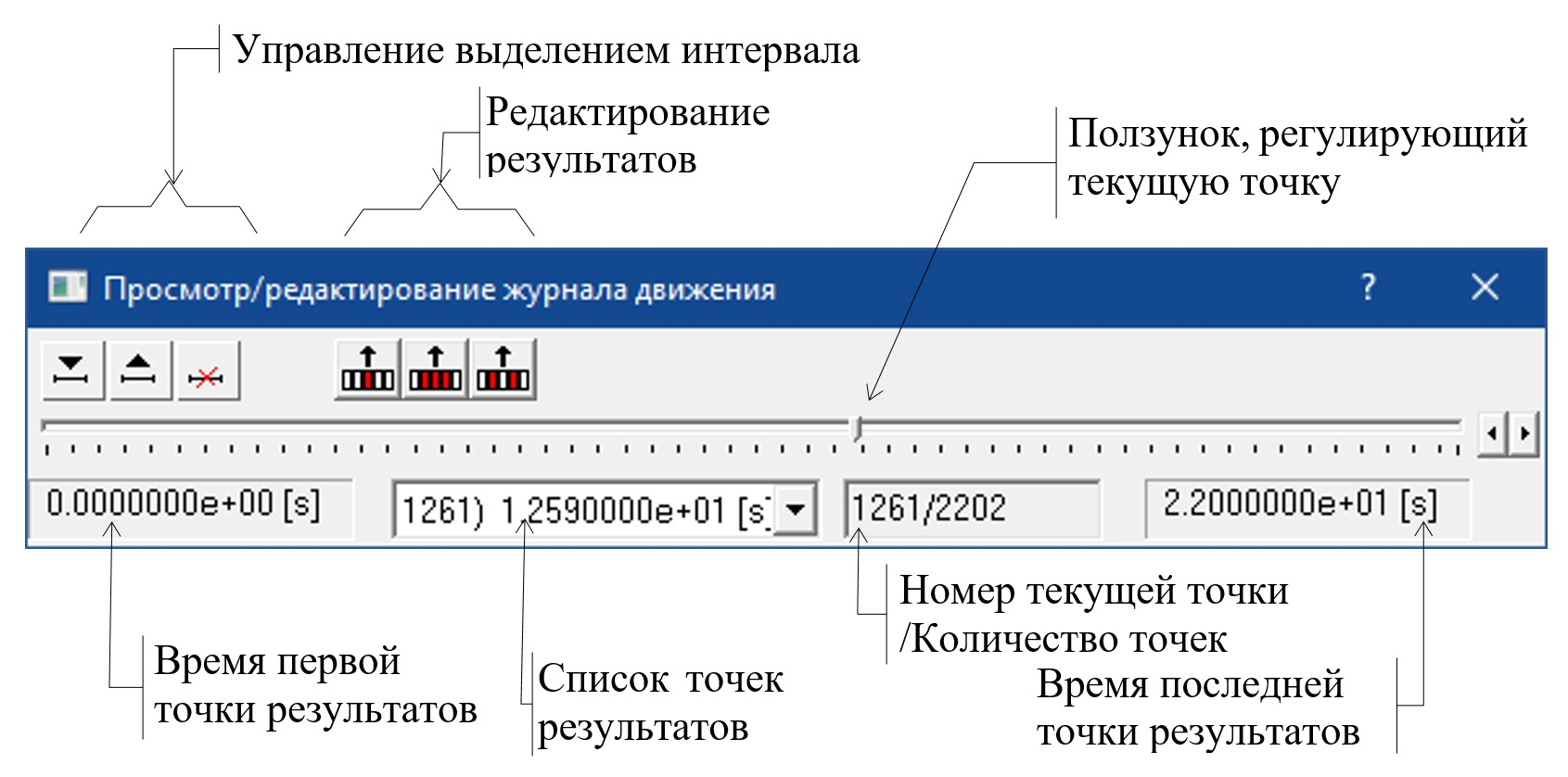 − Выбор текущей точки. Для быстрого изменения текущей точки просмотра результатов необходимо передвинуть с помощью мыши ползунок пульта управления или выбрать точку с нужным значением времени в выпадающем списке точек. При этом в окне Вид проекта сразу отображается положение ММС в выбранной точке. Для последовательного изменения текущей точки необходимо нажать и удерживать кнопки пошагового просмотра, находящиеся справа от линии прокрутки. Текущая точка будет изменяться по шагам с отображением движения ММС в окне Вид проекта.