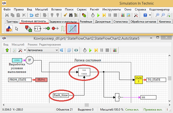 Войдите в субмодель автомата индикации и далее в состояние «выключен». Удалите блок «Выдержка состояния» и установите блок «Переменная выдержка состояния» из закладки «Конечные автоматы». Поместите так же на схему блок «Чтение из списка сигналов» из закладки «Данные». Установите в качестве имени сигнала flash_time. Схема должна выглядеть как показано на рис. 34.