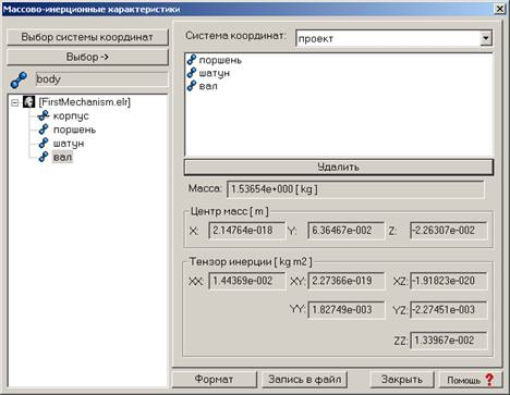 Массово-инерционные характеристики для выбранной группы объектов можно записать в файл. Для этого нажмите кнопку Запись в файл.