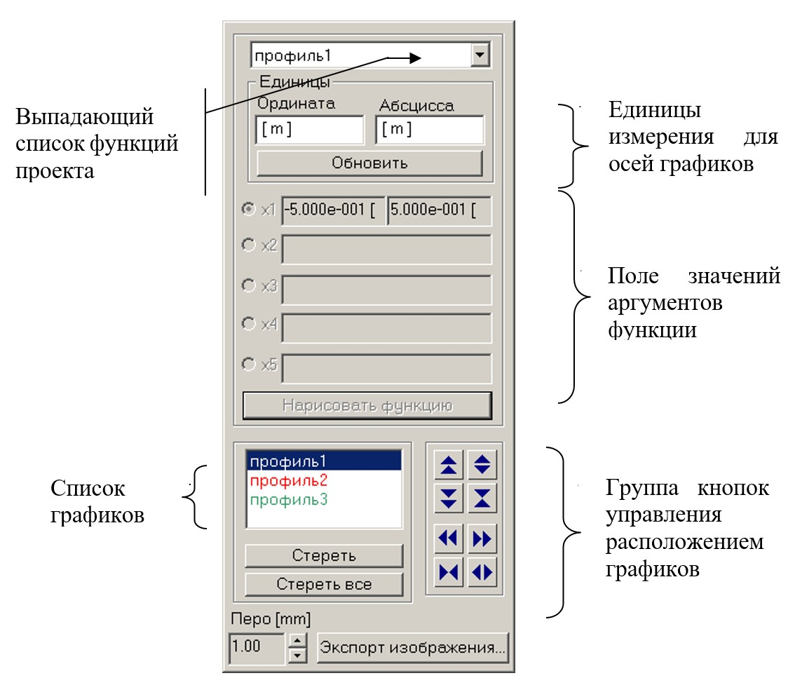 Список графиков содержит имена всех графиков, показанных в окне. Имя графика совпадает с именем функции. Функция выделенного в списке графика одновременно выделяется в выпадающем списке функций проекта. Под списком графиков находится кнопка Стереть. Она удаляет из окна выделенный в списке график.