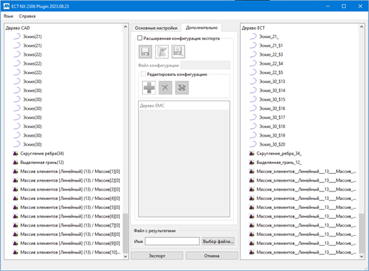 Под флажком «Расширенная конфигурация экспорта» располагаются кнопки чтения и записи EMC-файла: