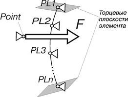 силового элемента перпендикулярна линии и проходит через точку Point. Точка FLP является точкой пересечения линии с базовой плоскостью