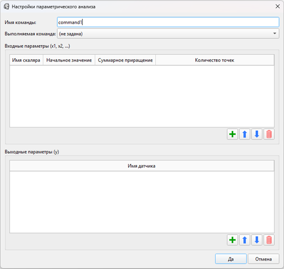 Таблица входных параметров – содержит список исходных варьируемых (входных) параметров. Каждая строка таблицы определяет данные для одного параметра. Столбец Имя скаляра содержит имя скаляра, который выбран в качестве варьируемого параметра. Столбец Начальное значение – начальное значение скаляра в исследовании. Столбец Суммарное приращение – суммарное приращение, которое будет добавлено к начальному значению параметра в процессе выполнения анализа. Количество точек – количество точек данного параметра, которое должно быть рассчитано при проведении анализа. Количество точек должно быть не менее двух.