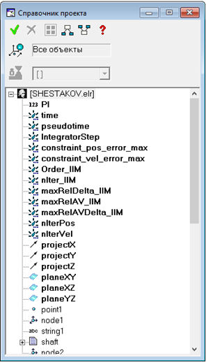 Окно Справочник проекта синхронизировано с другими окнами программного комплекса. При выборе какого-либо типа объекта, например, в окне Панель объектов, в окне Справочник проекта автоматически будут показываться только объекты этого типа. Объект выбранного типа может являться внутренним для другого объекта. Например, системный датчик (sensor) в шарнире (joint) или точка (point) в агрегате (assembly). В этом случае на первом уровне списка будет отображаться имя объекта-владельца. С левой стороны от имени внутреннего объекта-владельца отображается символ «+» (плюс). Если по этому символу щелкнуть левой кнопкой мыши, на экран выводится дополнительный список объектов искомого типа и, при необходимости, очередных объектов-владельцев.