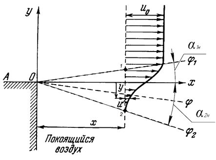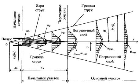При истечении в однородную среду свободная затопленная турбулентная струя постепенно расширяется и рассеивается (рис. 1).