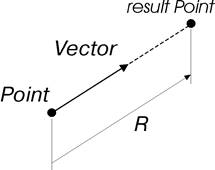 Данный метод создает точку, отстоящую от точки Point по направлению вектора Vector на расстояние R. Если значение R меньше нуля, то создается точка, которая отстоит от Point на расстояние abs(R) в направлении, противоположном направлению вектора Vector. Схема на рис. 7.
