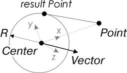 Данный метод создает точку касания окружности и прямой. Прямая проходит через точку Point и является касательной к окружности радиуса R и центром в точке Center. Окружность и прямая лежат в плоскости, нормаль которой определяется вектором Vector. Схема на рис. 3.