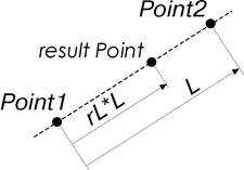 Данный метод создает точку, которая находится на прямой линии, соединяющей точки Point1 и Point2. Точка создается на заданном относительном расстоянии rL от точки Point1 в сторону точки Point2. Абсолютное расстояние от точки Point1 до создаваемой точки определяется по формуле