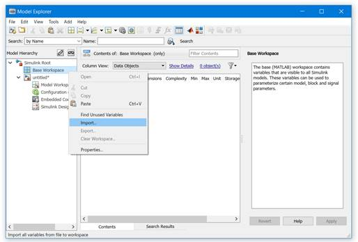 В появившемся диалоговом окне выберите слева поле Base Workspace, щёлкните по нему правой кнопкой мыши, выберите пункт Import (рис. 5). Найдите вашу копию файла Configuration_set_Euler.mat в появившемся окне, выберите её, нажмите Открыть.